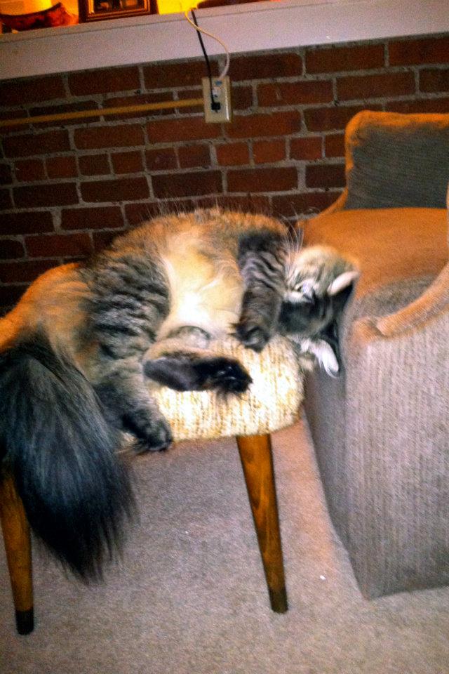 The Magician, during his time in the Hapsherd home, destroyed throw pillows, curtains, bedding, and Barbara’s favorite apron which stated a simple request that whomever be cooking receive a kiss. She had not once, in her twenty-eight year marriage, tasted the fruits of wearing such a request. A bed was built in her and her husband’s bedroom, so the four-legged terror could sleep near by. Charles only once went so far as to invite the cat into bed with them. It was the first time he had ever heard his normally very mild mannered wife raise her voice, and with reason, as it was also when The Magician destroyed two hand-stitched throw pillows that Barbara had inherited after her mother’s passing.